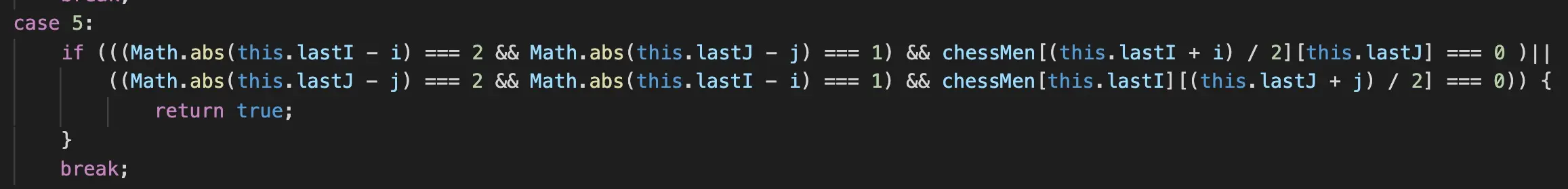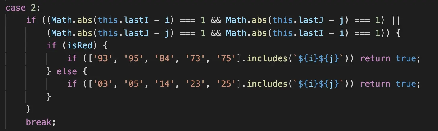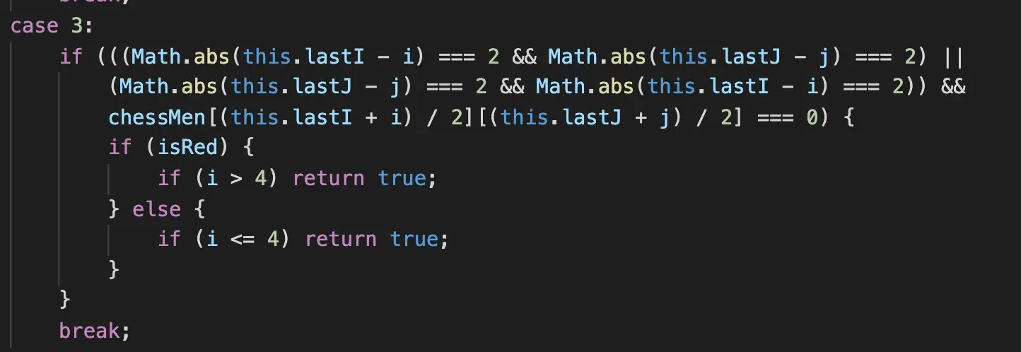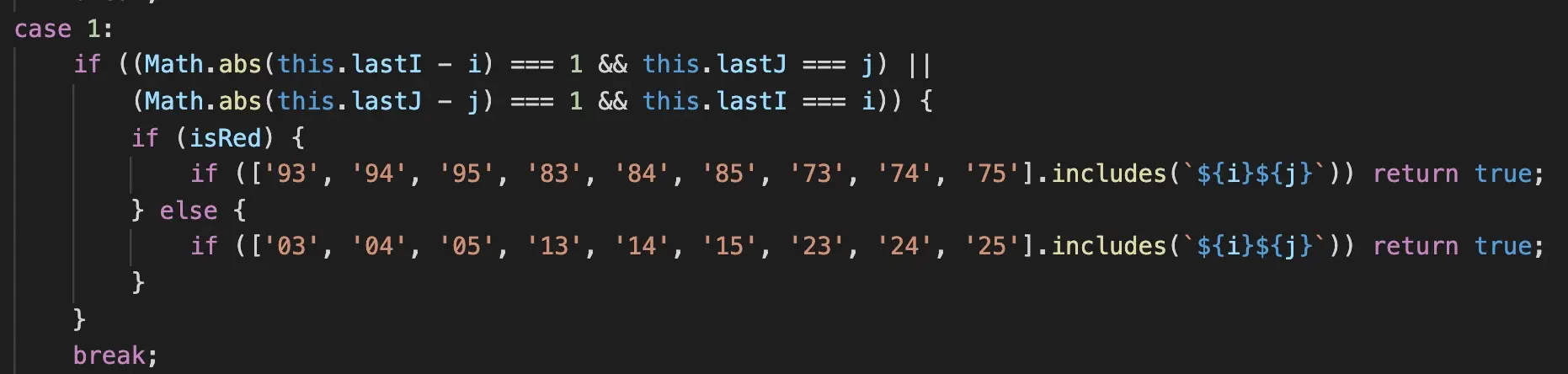 仅拿纵向举例,判断行进路线上仅有一个棋子(炮本身),或者有3个棋子(炮本身、中间棋子、目标棋子,且目标棋子在本次位移的终点)