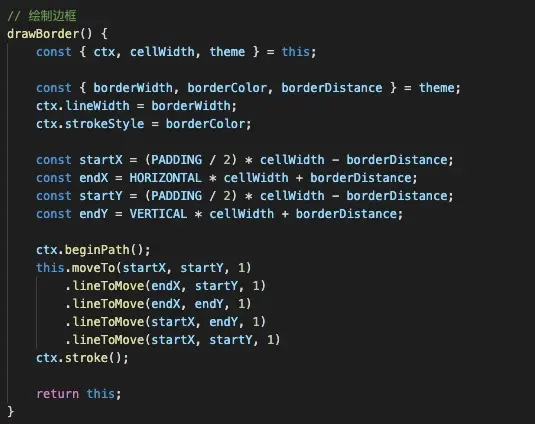 棋盘的网格外面还有一层边框,本来没有什么可说的,就是画四条线就可以,但是考虑到大家也可能有连续画线的需求,所以这里简单的说一下,我们可以将 ctx 的 lineTo 和 moveTo 封装到我们组件内的方法中,这样就可以不用 lineTo 某个点位后,又调一遍 moveTo 了。