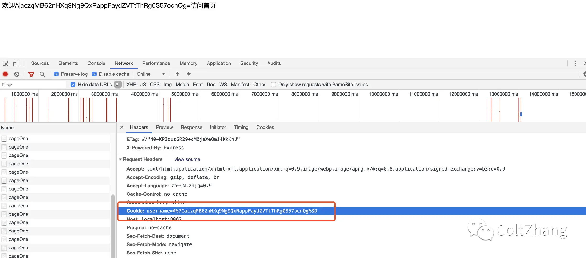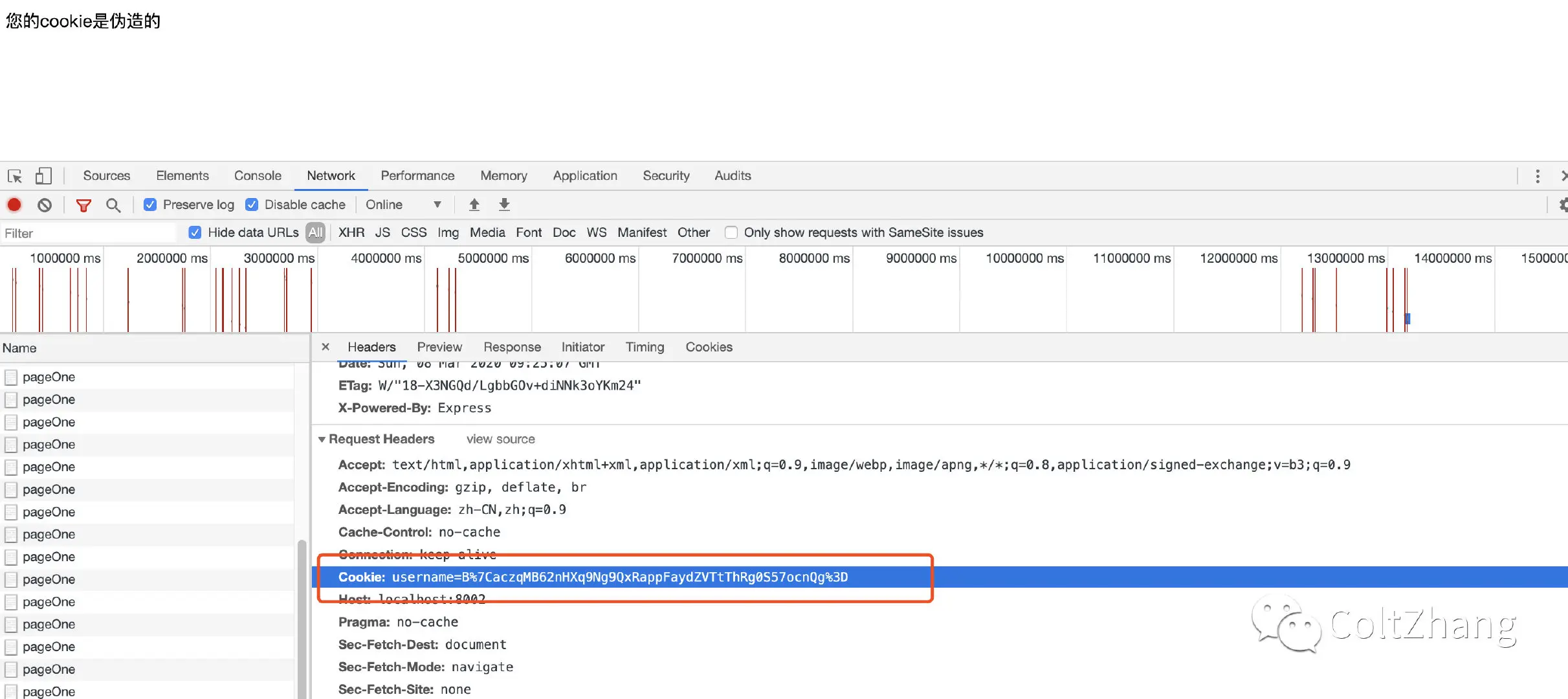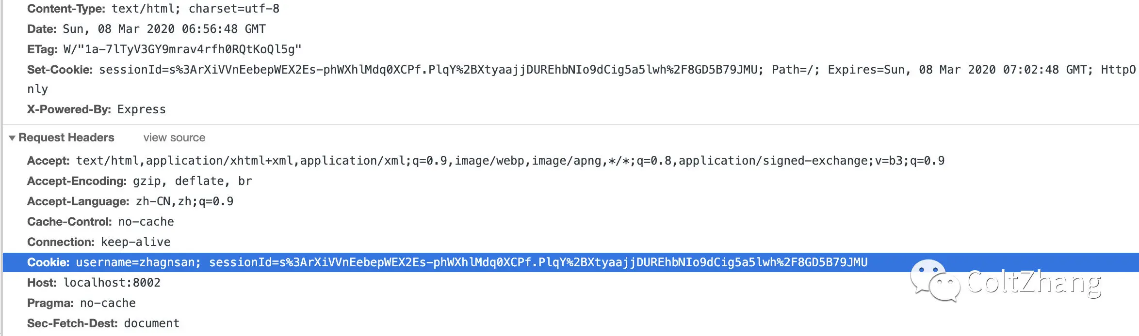 Cookie:sessionId=s%3Aa4hag_CW42vcykKBdxxxxxx,在服务器端存储sessionId所对应的数据,即使你想篡改sessionId也不知道从何改起,很大程度上保证了安全性。