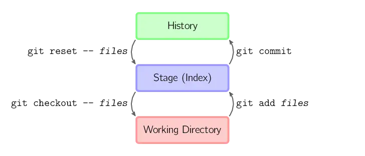 git add files把当前文件放入暂存区域。git commit给暂存区域生成快照并提交。git reset --files用来撤销最后一次git add files,你也可以用git reset撤销所有暂存区域文件。git checkout --files把文件从暂存区域复制到工作目录,用来丢弃本地修改。