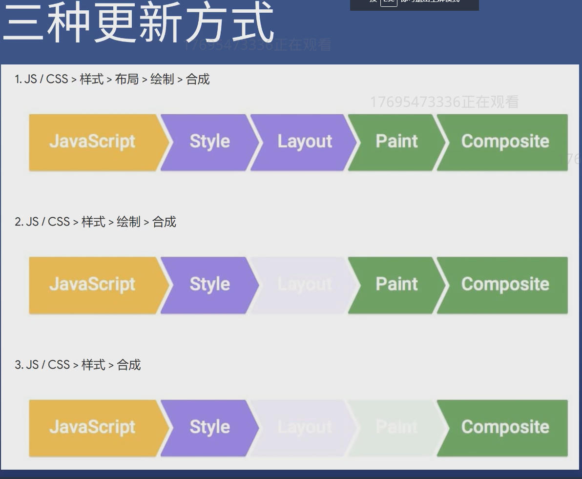 全走:div.remove(); 会触发当前元素消失,其他元素要重构、绘制和合成 跳过layout:改变背景颜色 跳过layout和paint:改变tansform 所以尽量使用transform可优化动画效率