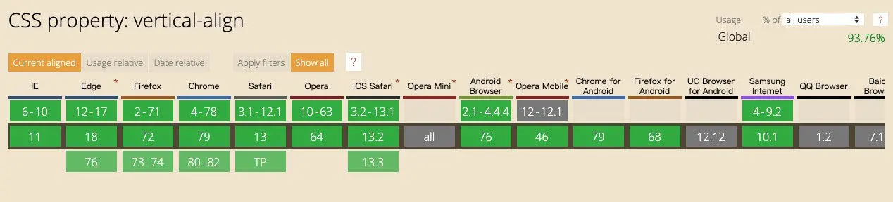 使用 vertical-align 你能在不同场景下去进行灵活细微的元素对齐工作,并且它有很好的的兼容性,详情如下图所示:
