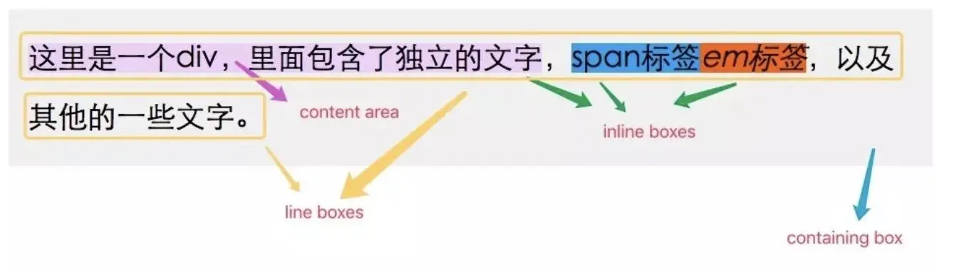 inline boxes: 不会成块显示,而是并排显示在一行的 boxes ,如span,a,em等标签以及匿名 inline boxes(即不含把标签的裸露的文字) -