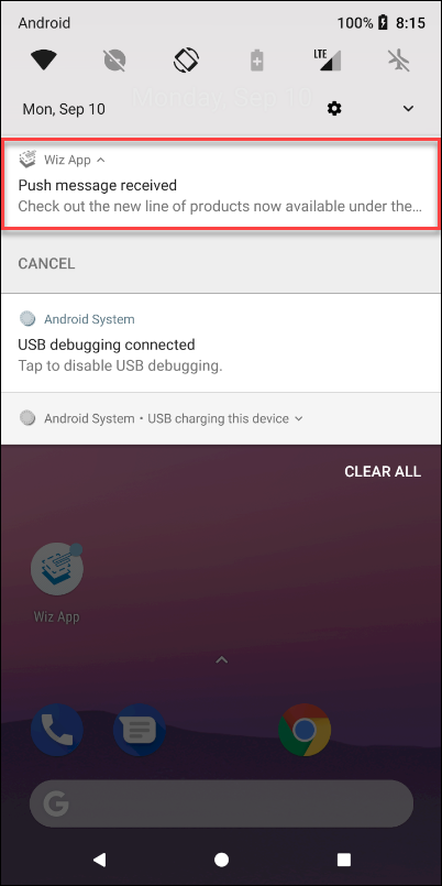 如果我们测试的应用当前处于后台运行状态,则来自SAP Cloud Platform的Notification推送到达移动设备后,表现形式如下: