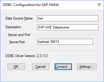 在此处指定使用HDBODBC连接的SAP HANA Express地址: