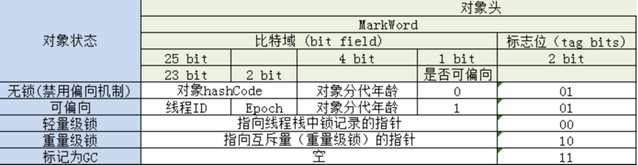 Mark Word 用于存储对象自身的运行时数据,它是实现轻量级锁和偏向锁的关键,所以下面将重点阐述 Mark Word 。