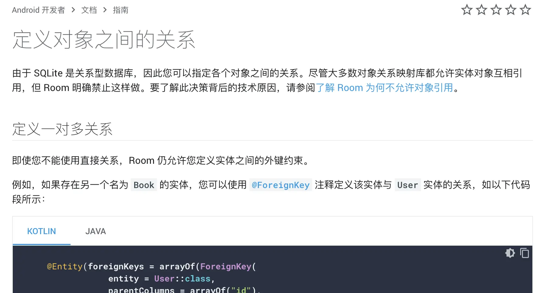 目前 Room 更新了它的文档,帮助大家更好的去定义对象之间的关系。正如上图中所说,Room 虽然是关系型数据库,但它禁止实体对象之间互相引用,所以在新的文档中,Room 提供了以下三种定义对象之间关系的方式: