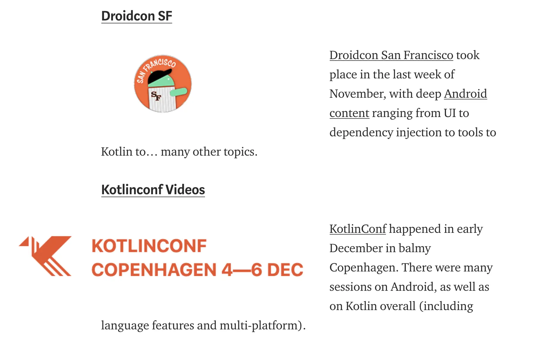 这里分享两个会议网站,Droidcon SF 和 Kotlinconf Videos ,他们发布了很多有关 Android 和 Kotlin 的会议视频,感兴趣的同学可以从下方的链接中查阅。
