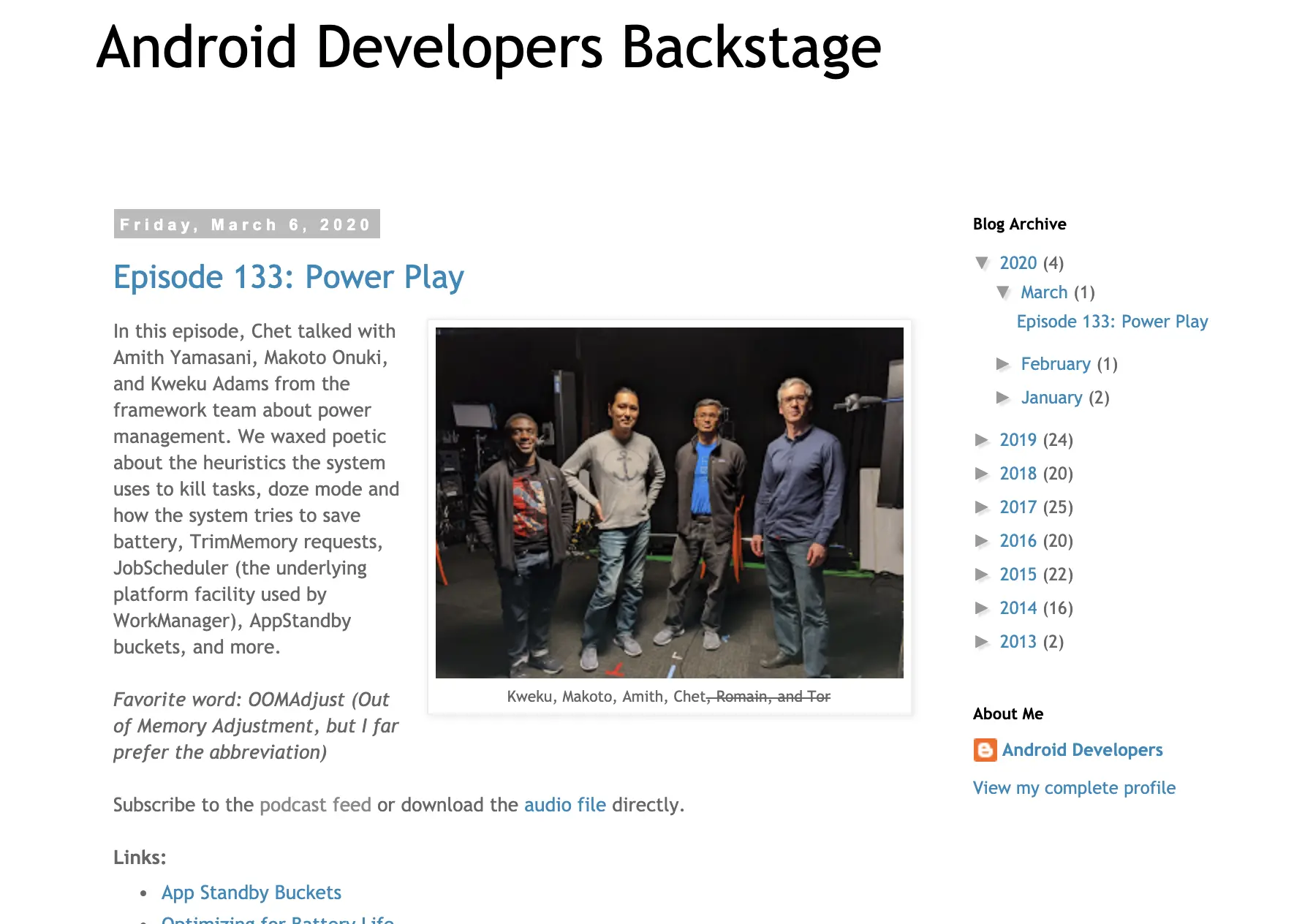 Android Developers Backstage 是由 Chet Haase 参与创办的播客频道,至今已经创办了 5 年超过 130 期节目,每一期他们都会讨论和分享关于 Android 的方方面面,从代码到设计、从软件到硬件,如果你感兴趣,欢迎关注订阅。