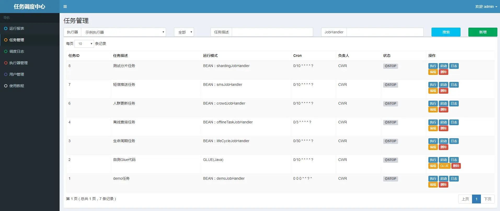主要提供了任务的动态配置管理、任务监控和统计报表以及调度日志几大功能模块,支持多种运行模式和路由策略,可基于对应执行器机器集群数量进行简单分片数据处理。