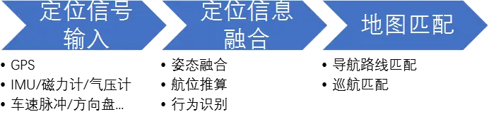 对于车机,通过CAN总线获取的车速脉冲、方向盘转角等信息是另一类重要的定位输入。基于上述定位信号,应用姿态融合、航位推算等算法,计算出连续可靠的位置和姿态。再依据地图数据将人/车的实际位置与地图道路关联,实时判断当前是否已经偏离导航路线,或更新当前在导航路线中的相对位置。