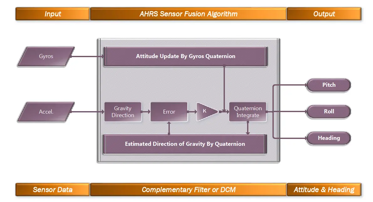 常用的姿态融合技术又称为AHRS(Attitude and heading reference system )。对于六轴惯性传感器融合,包含陀螺仪和加速度计,其AHRS算法如下图所示。陀螺仪测量的是角速度,角速度积分即可得到某一时间段内的角度变化。加速度计测量的是物体的加速度,包含重力加速度,当静止时,通过获得重力加速度在三个轴上的分量可以计算相对倾斜角度。AHRS算法采用滤波方法,如互补滤波、Kalman滤波,对不同传感器姿态进行融合。
