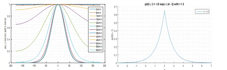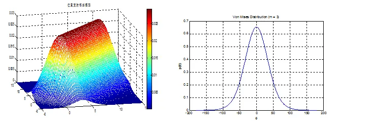 2)对定位方向,与道路方向越接近概率越大,反之概率越小。同时概率与速度有关,速度越大越可信。采用Von Mises分布,以速度为超参数建立模型。