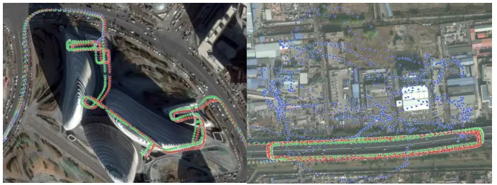 下图展示了采用后端融合方案的车机导航定位效果。图中蓝色是GPS位置,红色是高精度基准设备的定位轨迹,绿色是车机导航定位轨迹。可以看到,在GPS被遮挡的停车场,或GPS被干扰的区域,车机导航定位始终可以持续稳定的输出高精度的定位位置,保证了车载导航功能的可靠运行。