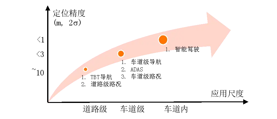 对于车道级导航,定位需要能分辨出汽车当前所在的车道,这就要求定位精度达到米甚至亚米级,而对于更先进的智能驾驶应用,为保证安全,需要定位精度达到厘米级。