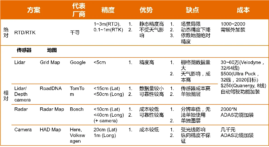 为达到更高精度的定位能力,需要对现有的定位手段进行升级。一种升级的方法是,对现有的定位输入源直接升级,如普通GPS升级为更高精度的RTK-GPS,低成本MEMS惯导升级为高精度惯导,这样可以在基本不改变原有算法框架的基础上直接获得高精度的定位能力。但缺点是,原有算法的缺陷,如长时间GPS丢失场景的累积误差问题依然存在,且成本较高。另一种方法是引入新的定位源,如激光雷达、毫米波雷达、摄像头等。这就需要针对这些新的传感器开发新的融合定位算法。不同的高精定位方案对比如下表。