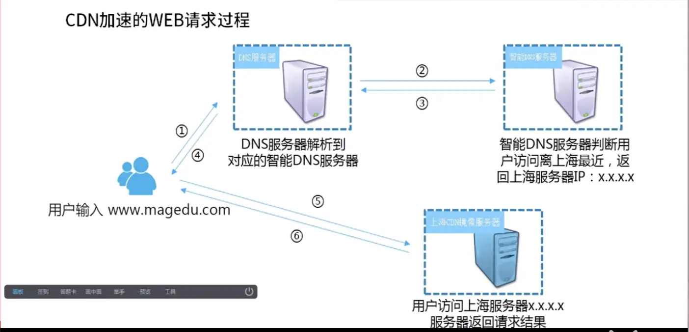 CDN的工作流程与DNS解析息息相关,它只是在DNS解析流程中加入了智能DNS(调度DNS)这一步骤,当客户发出网络请求时,智能DNS服务器会根据你的IP地址判断出你的位置,然后返回最近距离的服务器的IP地址,而不是直接返回源站IP。