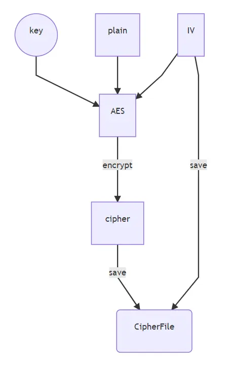 加密后,把加密的参数 IV(Initial Vector) 和密文 cipher 一起保存下来 CipherFile。密钥 key 和被保护的数据明文 plain 不保存。