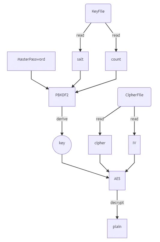 用户设置主密码后,密码管理器通过 PBKDF2 生成了加密密钥 key,并且把参数 salt 和 count 保存起来 KeyFile。