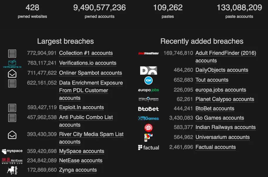 已经有很多互联网服务都泄露密码了,have i been pwned 能收集到证据的记录就已经超过地球人口总数了,~95亿。