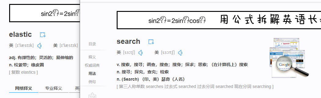 Elasticsearch是什么?为什么每次学习一门技术都是英文的呢?真的是脑阔疼。既然它是英文的,我们不妨借助有道来初步的看看Elasticsearch到底是何方神圣,竟如此多娇。其分为elastic和search两个独立的单词,我们来无脑有道一波看看,得到的解释如下:
