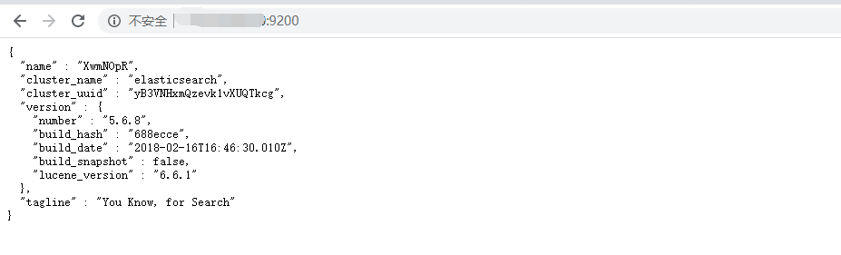 当然了,我们也可以使用浏览器来对其进行访问,访问方式为http://[ip]:9200,端口为虚拟机ip,同样可以得到对应的结果,另外如果使用的是Aliyun或腾讯云服务器,则需要在控制台中配置相应的安全组,否则无法访问