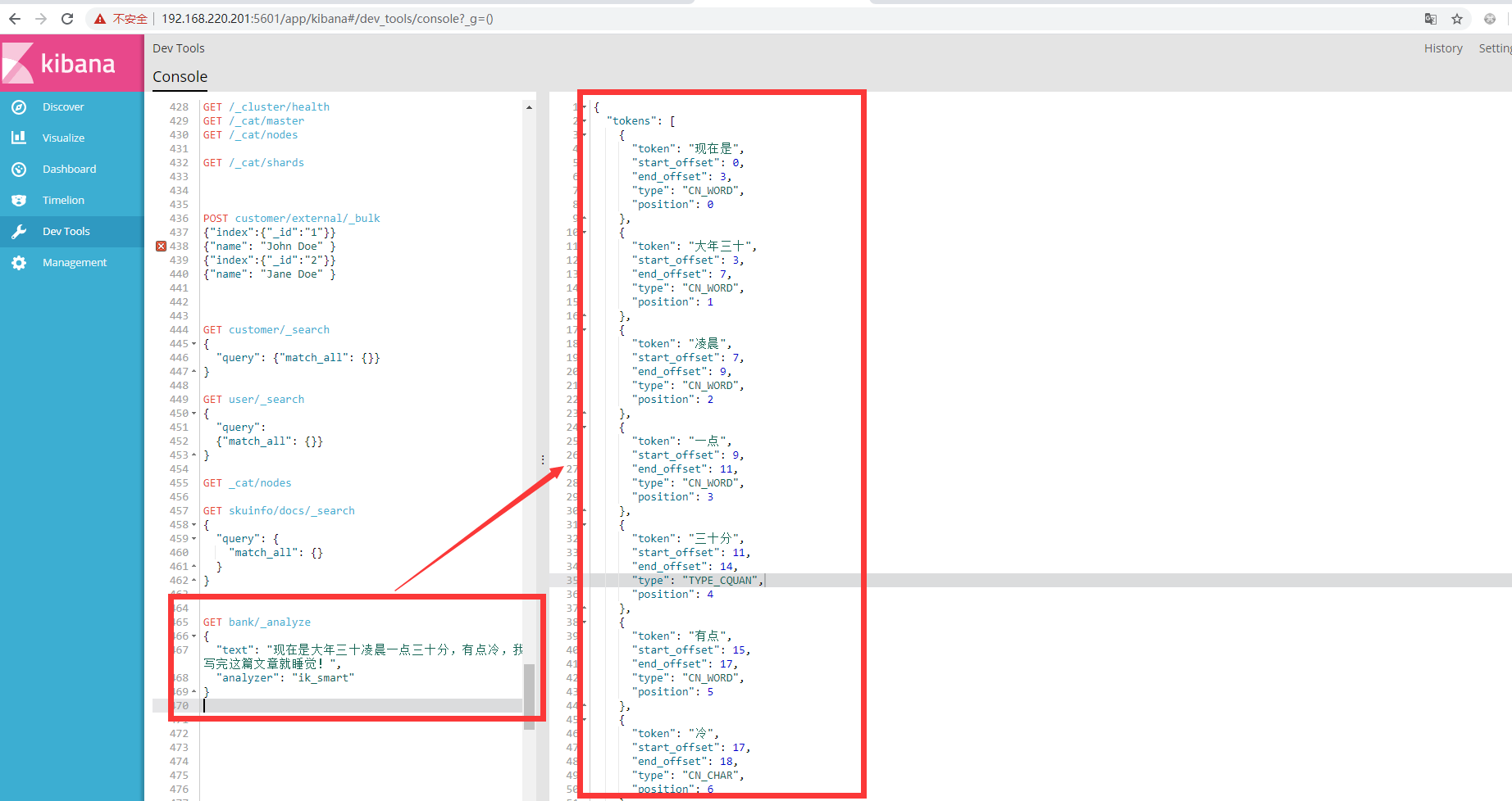 # 进入kibana的Dev Tools界面,然后使用如下测试ik中文分词器插件是否正常安装
