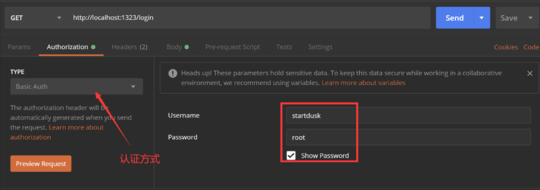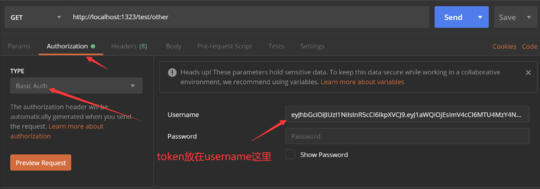 到这步,我们既然用了 jwt 颁发令牌(即 token),那么在 BasicAuth 中要传递的两个参数 username 和 password 只用 在一个参数中传递 token ,一般是在 username 中传递,password 不用传参数,那么 auth 部分的代码修改为: