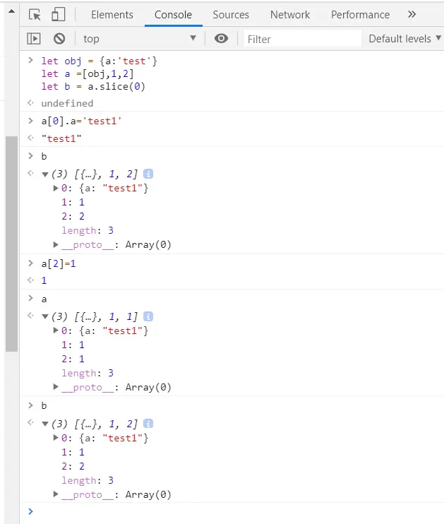 我们可以看到上面有个这样的一段代码。我专门搜了搜,说是有两个功能。 我们使用slice(0)对原始数组进行一个深拷贝和将类数组对象转化为真正的数组对象,当时我看到这的时候确实不太了解,看了看,然后才发现Vue中有很多类似的写法,哈哈,有兴趣的可以再stackoverflow看看 注:我的第一个评论,开心,先声明一下啊。关于slice(0)的使用。我最开始是百度搜索,唯一搜到的是这个文章"blog.csdn.net/i042416/art…",里面给了两种说法和stackoverflow的链接,这个深浅拷贝很好验证,控制台稍微打印一下,可以验证,如下图,但是关于这个知识点需要好好梳理一下,这里算是在给自己加个坑把。