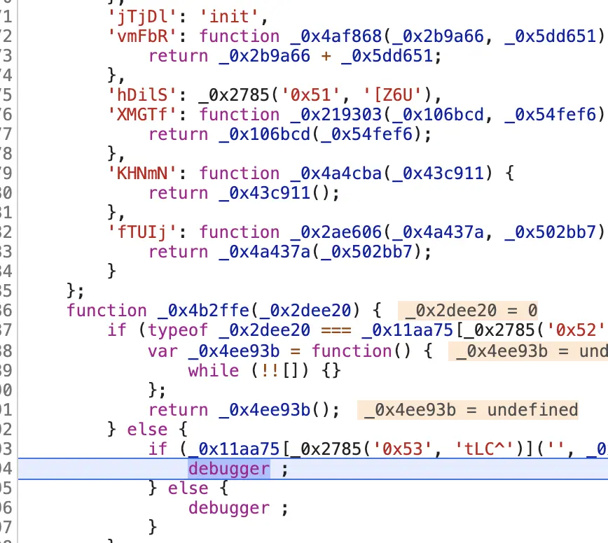 虽然我们看到很多_xxxxx的代码,但是不难发现一个规律,这些是由下划线 加 16进制数字组成的js合法变量名,这就是第一步混淆、压缩(图片已解压)。然后我们还看到了几个明显的debugger,这就是阻止我选中dom的主要根源,一个死循环断点,我们可以换一个清晰地代码进行演示:
