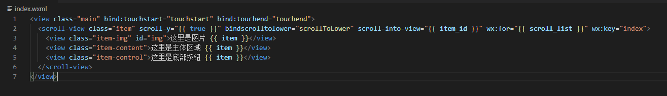 主体html其实东西很少,主要分为两部分:一个主体的view和一个长内容的scroll-view;