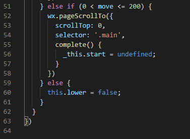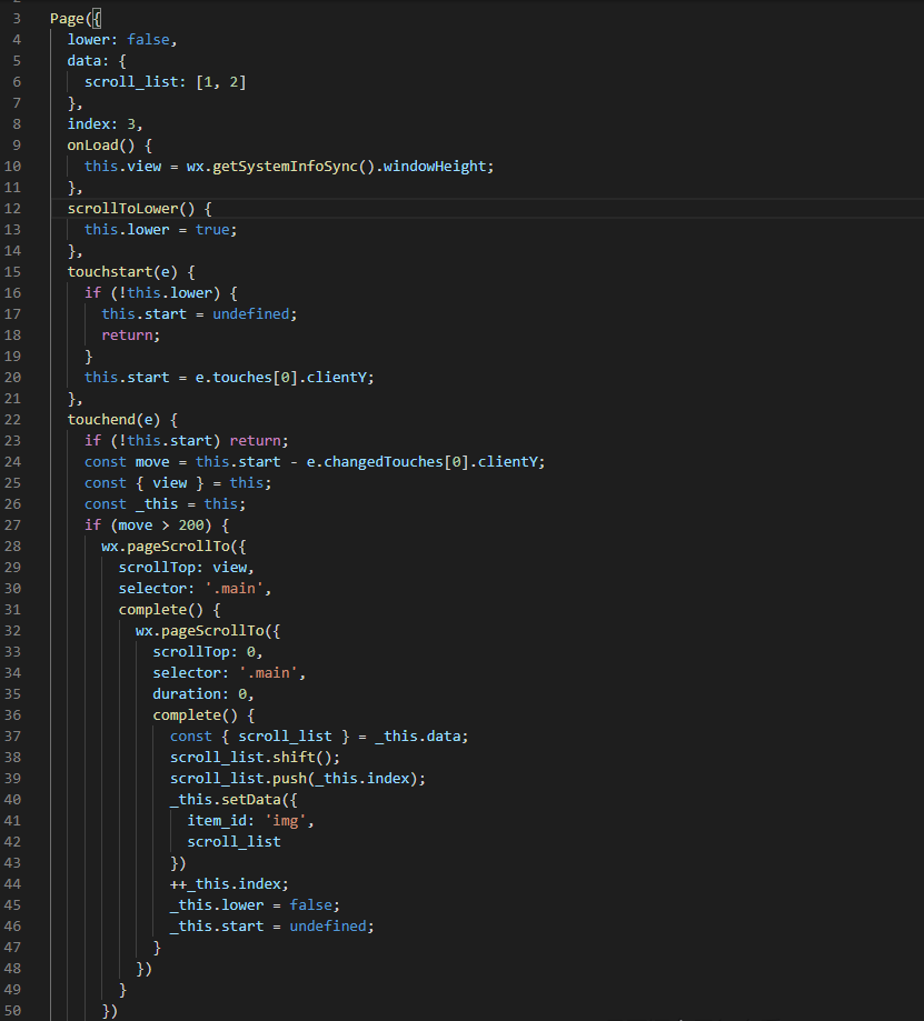 touchend(e) { if (!this.start) return; const move = this.start - e.changedTouches[0].clientY; // 计算上拉距离 const { view } = this; // 屏幕高度 const _this = this; if (move > 200) { wx.pageScrollTo({ scrollTop: view, selector: '.main', complete() { wx.pageScrollTo({ scrollTop: 0, selector: '.main', duration: 0, complete() { const { scroll_list } = _this.data; // 初始为scroll_list: [1, 2] scroll_list.shift(); scroll_list.push(_this.index); // 第一次滚动后scroll_list: [2, 3] _this.setData({ item_id: 'img', // 将内的滚动位置设置为内的顶部 scroll_list }) ++_this.index; _this.lower = false; // 初始化滚动监听枷锁 _this.start = undefined; // 初始化点击起点位置 } }) } }) } else if (0 < move <= 200) { wx.pageScrollTo({ scrollTop: 0, selector: '.main', complete() { _this.start = undefined; } }) } else { this.lower = false; } }