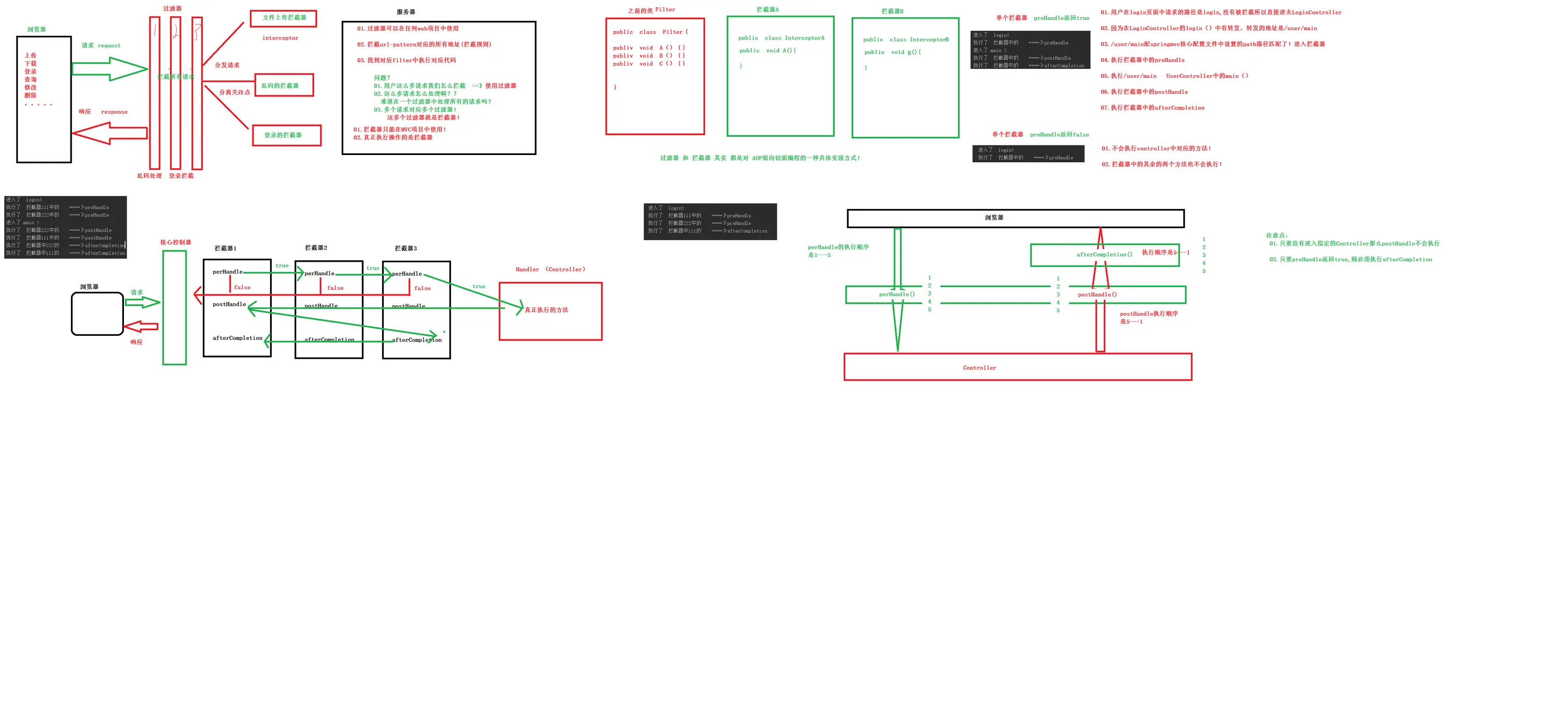 1.程序先执行preHandle()方法,如果该方法的返回值为true,则程序会继续向下执行处理器中的方法,否则将不再向下执行。