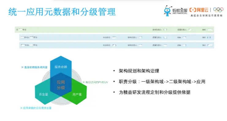 那么接下来是持续集成环节,首先给大家介绍的是统一的应用元数据管理。在蚂蚁我们有5000多应用,规模非常之大,而且支撑的业务也各不相同。我们给应用做了分级定义,主要是从服务依赖、交易/资金量以及每天的PV UV这些维度对应用进行分级,并在平台中进行统一管理。第一个好处,所有的应用以及架构一盘棋,组织层面可看到全貌,为整个架构的规划以及架构的治理,提供比较好的输入以及基础;第二个好处,每个架构域每个应用的技术负责人、质量负责人、运维负责人等角色一清二楚,有利于在项目中进行协作;第三个好处是应用的属性,通过应用分级和应用属性,为精益研发流程定制提供依据,做到研发流程的千人千面,每个应用都可以定制自己的个性化的研发流程。