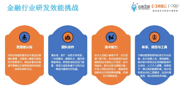 看完蚂蚁,我们再看看整个金融行业,金融行业做研发效能和DevOps,有哪些共同的挑战?我们总结下来四个方面: