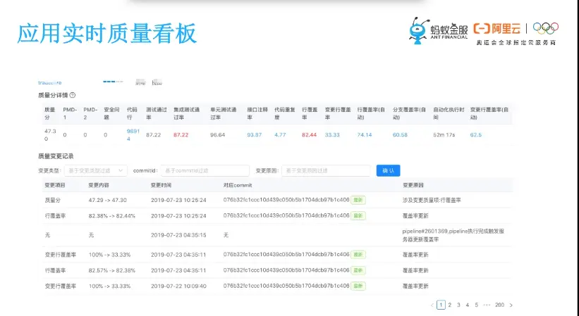 当每个流水线组建执行之后,那么应用的质量看板会实时的更新,这里边我们也做了一个截图,比如说质量分, PMD安全问题,还包括测试的通过率、覆盖率,除此之外,我们还提供一些代码行接口、注释率、重复度等基本的统计信息。每次代码变更,我们都能够看到整个质量分,包括质量数据的更新变化情况,做一个很好的追溯。