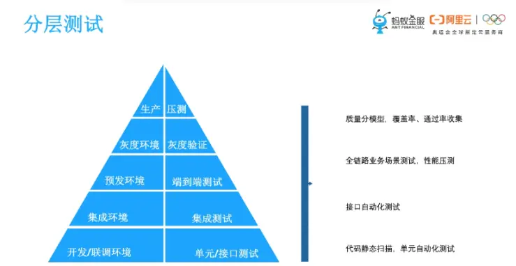 接下来进入测试验证部分,首先是分层测试的能力,我们主要谈两个方面。首先就是测试环境、环境策略,从开发到集成、预发、灰度,我们的环境一步步的去接近和模拟生产环境,确保生产发布最后是没有问题的。其次就是分层自动化测试验证能力,我们将单元自动化、接口自动化,结合研发效能平台,灵活的通过Pipeline流水线的组件去执行,统一赋能给全蚂蚁的研发团队。