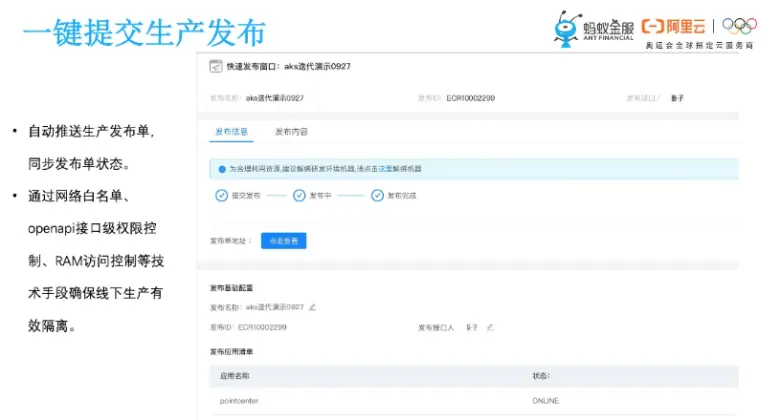 然后是一键提交生产发布。对于金融机构来讲的话,监管对线上和线下隔离这一块有明确的要求,所以线下我们支持自动部署,线上的话我们提供这种一键提交生产发布的能力,自动推送发布单并同步查询发布单的状态,这样有发布权限的同学就可以登录到生产环境去执行发布了。在这个过程里边,我们通过网络白名单、open API接口级别的权限控制这些技术手段,来确保线上和线下是真正有效隔离的。