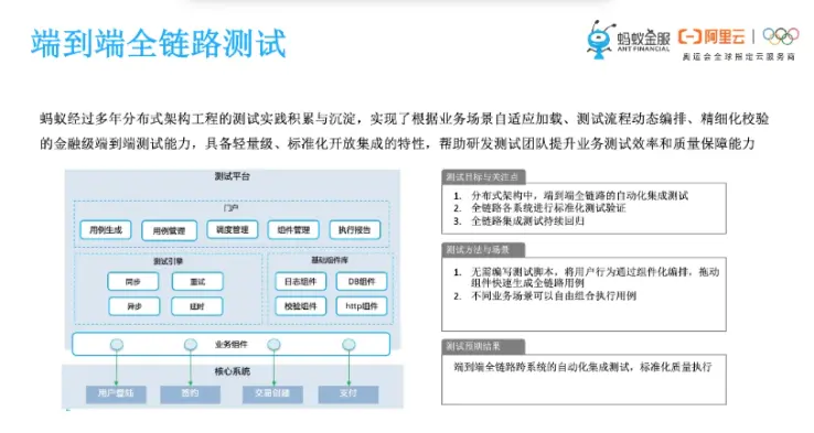 前面提的,无论是单元自动化还是接口自动化,都是应用及系统级别的测试。那么端到端的话一般都更带有业务属性,全链路的测试。蚂蚁经过这么多年在分布式架构工程测试领域的积累,沉淀了这种根据业务场景自适应加载测试流程,动态编排,精细化校验的金融级的端到端的测试能力,它又轻量又标准,帮助研发测试团队提升业务测试效率和质量保障能力。