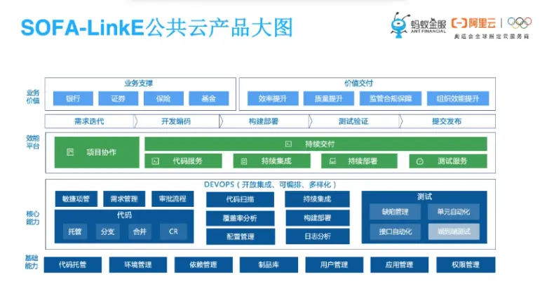 在蚂蚁金服开展这么多的研发效能的工程实践,那么我们的平台是如何来支撑的?首先是 SOFAStack-LinkE的公共云的产品大图,上面是支撑的业务以及交付的价值,我们重点介绍中间产品层,目前我们提供了两个组件,一个是项目协作,主要就是包括需求、项目、冲刺和工作项的管理。然后第二个组件就是持续交付,从编码到测试、到部署、到发布,整个端到端的支撑,下边有配套的代码服务,持续集成、持续部署、测试服务的这些组件。