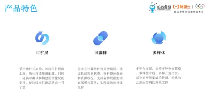 就平台产品特色而言,主要体现在三个方面:可扩展、可编排、多样化。可扩展主要指的是Pipline流水线的组件是支持自定义的;可编排体现在研发迭代流程及流水线,可根据业务需要对其进行配置;多样化支撑多种分支策略,多种技术栈,经典与云原生架构的双模支持。