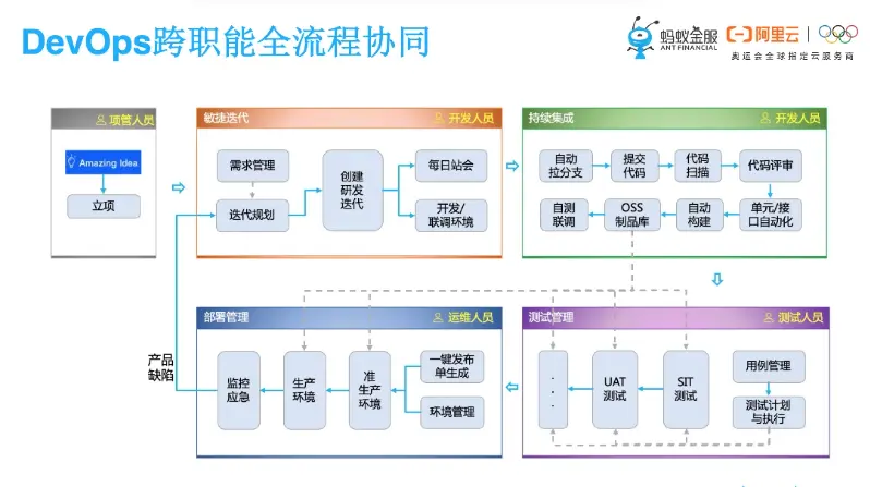 接下来是最后的解决方案部分,做研发效能其实还是要想实现整个DevOps跨职能的全流程协同,不同的职能团队能够高效地协同在一起,特别是开发、测试和运维。
