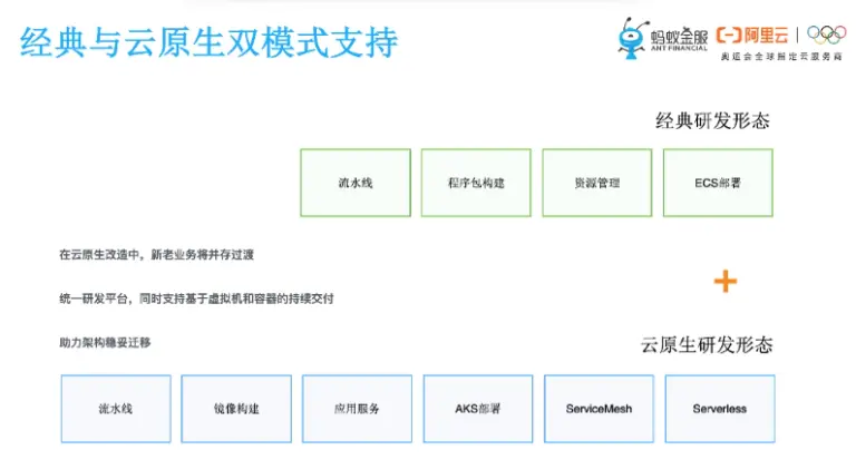 接下来我们谈到云原生,随着蚂蚁金服对云原生理念的理解越来越深,我们相信未来的金融级应用场景都会往这种极致的弹性和混合云方向去发展。所以我们的架构也一直在不断的演进,去拥抱云原生。向云原生新型技术转变的过程里边,不同场景的应用很难一步到位,所以为了满足这种业务的需要,我们同步的去支持经典的研发模式以及云原生的研发模式。在云原生的改造中,老业务、新老业务并存过渡,通过统一的研发平台,同时支持基于虚拟机和容器的双模持续交付,助力于整个架构的稳妥的演进和迁移。