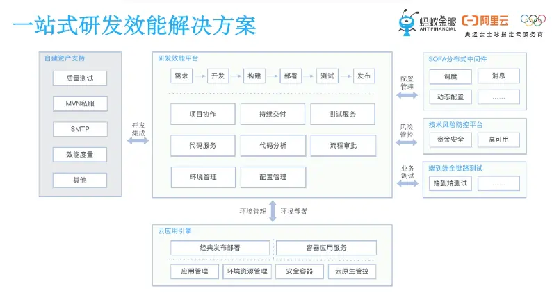 介绍一下蚂蚁一站式研发效能解决方案。下图中间部分属于蚂蚁研发效能平台的范围,提供从需求到发布的整个持续交付的引擎,将整个DevOps的工程能力集成串接在一起,具体能力前面都有提到。大图底部是应用PaaS平台,就是咱们SOFAStack运维管理相关的组件,效能平台通过open API和它交互,打通整个环境管理和环境部署这些功能,也实现了经典发布部署和容器应用服务的双模支持。大图右侧是对蚂蚁智能科技其他产品的集成和支持,通过研发容器统一管理多环境的中间件配置,实现环境的隔离,迭代推进过程中不同环境之间的自动同步和生效。另外我们支持技术风险防控平台以及端到端测试等产品的集成和联动。蚂蚁研发的平台本身具备开放集成能力,所以可以通过自定义组件的方式来对接其他平台的能力以及业务自建的一些资产,比如说质量测试等工具,最终实现一站式的智能研发平台的方案。