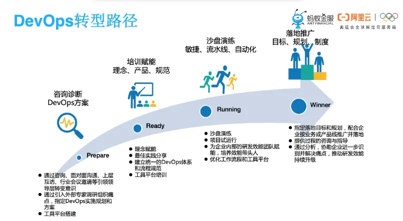 最后给大家介绍的是整个DevOps转型的一个路径,大概分这几个阶段: 第一个阶段就是咨询诊断阶段,出具DevOps的实施方案以及落地规划,包括平台的搭建。第二个阶段就是培训赋能,这里边就包括理念的培训,产品的培训,要建立统一的体系和流程规范。第三个我们提供沙盘演练,让项目组的同学真正的了解敏捷、流水线和自动化,通过在项目里试运行,为企业内部研发效能团队赋能,培养带头人。第四制定落地的目标和规划,配合企业按照业务或者按照产品线去落地实施,通过日常监控以及数据的分析,能够持续的去解决痛点,去推动效能的持续提升。