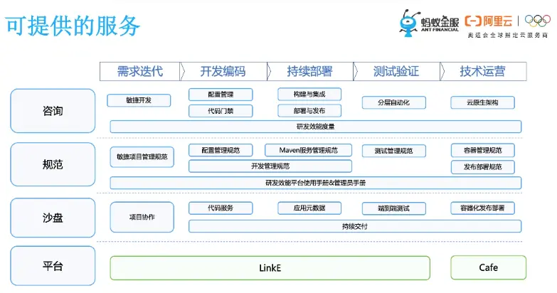 那么我们可以提供哪些软性的服务,下图展示了咨询及其具体领域,然后我们可以和客户一起来针对痛点建立研发规范,我们还提供沙盘帮助用户快速的在实际项目里边去演练整套的规范以及平台工具。