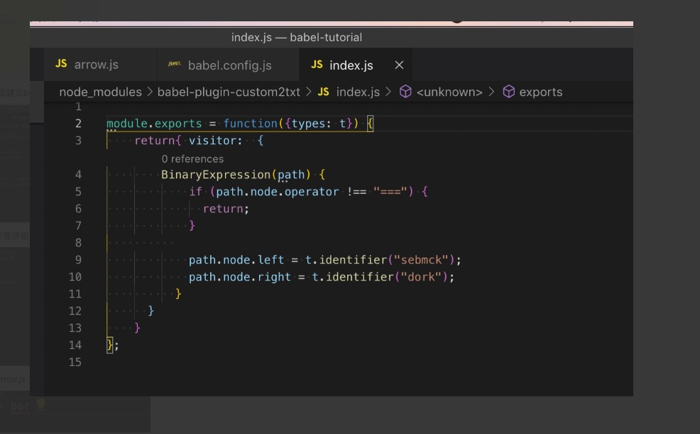 这是一个插件的基本格式,一个函数,参数是babel,这里我们用到的是types这个属性,所以只把它写出来,然后就是返回一个对象,key是visiter,然后里面又是个对象,但是key是我们熟悉的东西,就是一个babel-types类型,然后是一个箭头函数,函数有两个参数,path表示路径,state表示状态。