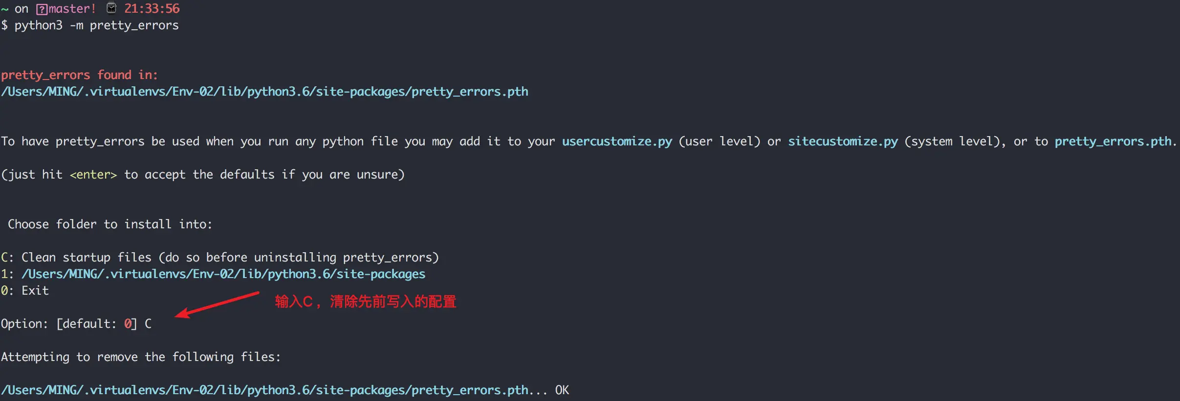 只需要再次输出 python -m pretty_errors,输出入 C 即可清除。