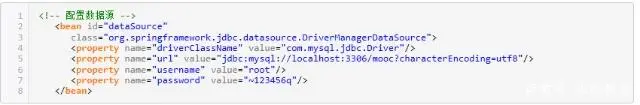 需要让Spring框架知道数据库的位置及其连接方式,这个工作由DataSource完成。Spring框架通过DataSource连接数据库,DataSource既可以在Spring框架的配置文件中配置,也可以放在Bean类中配置。下面是在Spring配置文件中配置数据源的代码。