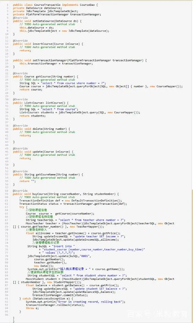 CourseTransactio类实现了CourseDao接口,CourseDao是访问mooc数据库的顶层接口,接口提供了mooc数据库表的增删改查操作。CourseTransactio主要实现了CourseDao类的buyCourse,实现学生购买课程事务。购买课程事务涉及到更新teacher表,在student_course表增加一条购买记录,更新student表的余额字段数据库操作,这些操作需要进行连续处理,中间不能中断出错,如果出错则需要做回滚处理。 因此,buyCourse方法采用数据库事务进行处理。